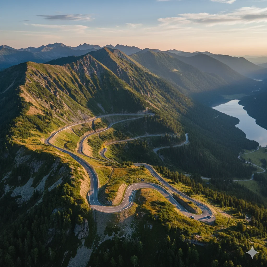 photo: Adrian Dascal, drone shot of Romanian serpentine roads at Unsplash