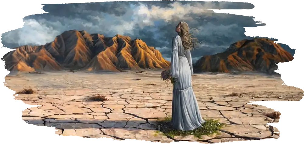 The picture describes the world we inhabit. Joyless and dry, cracked and overcast-- here is only barrenness. Any perusal through our windows, computer or otherwise, can draw a comparison. On the other hand, the bride stands in that place her Lord has given her. And there is life there. But she longs to be with Him.